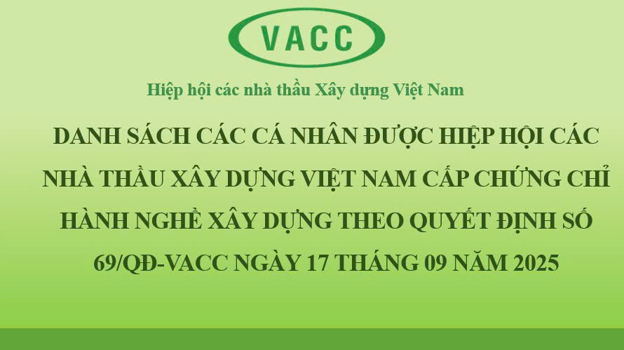 DANH SÁCH CÁC CÁ NHÂN ĐƯỢC HIỆP HỘI CÁC NHÀ THẦU XÂY DỰNG VIỆT NAM CẤP CHỨNG CHỈ HÀNH NGHỀ XÂY DỰNG THEO QUYẾT ĐỊNH SỐ 69/QĐ-VACC NGÀY 17 THÁNG 09 NĂM 2025