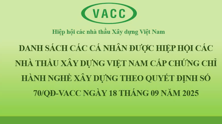 DANH SÁCH CÁC CÁ NHÂN ĐƯỢC HIỆP HỘI CÁC NHÀ THẦU XÂY DỰNG VIỆT NAM CẤP CHỨNG CHỈ HÀNH NGHỀ XÂY DỰNG THEO QUYẾT ĐỊNH SỐ 70/QĐ-VACC NGÀY 18 THÁNG 09 NĂM 2025
