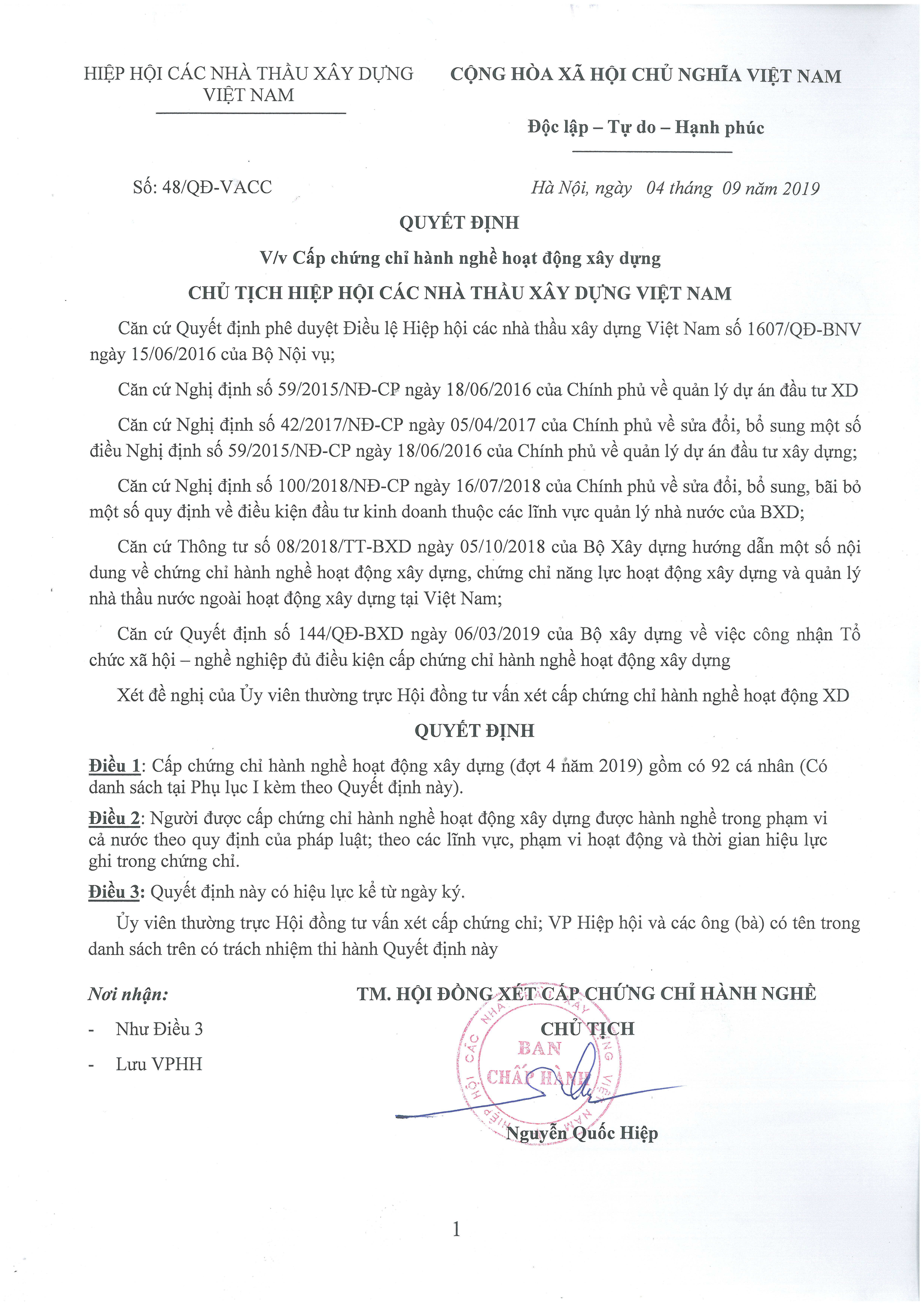 Căn cứ kết quả kiểm tra hồ sơ là kết quả sát hạch cấp chứng chỉ hành nghề đã được Hội đồng xét cấp chứng chỉ hành nghề hoạt động xây dựng của Hiệp hội các Nhà thầu Xây dựng Việt Nam tổ chức ngày 03/08/2019, Cục Quản lý hoạt động xây dựng cấp mã số chứng chỉ hành nghề Tư vấn giám sát xây dựng cho 92 cá nhân có kết quả đạt yêu cầu như sau: