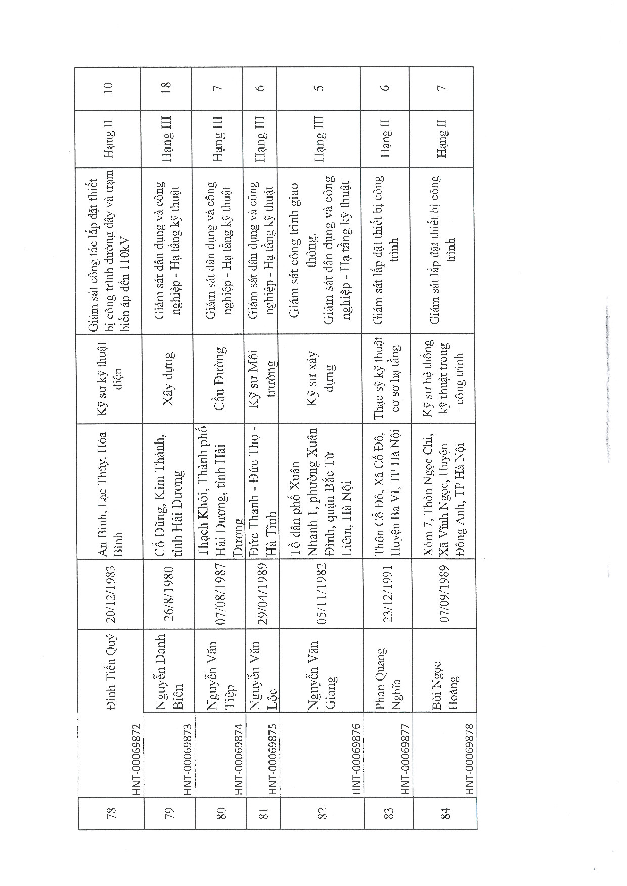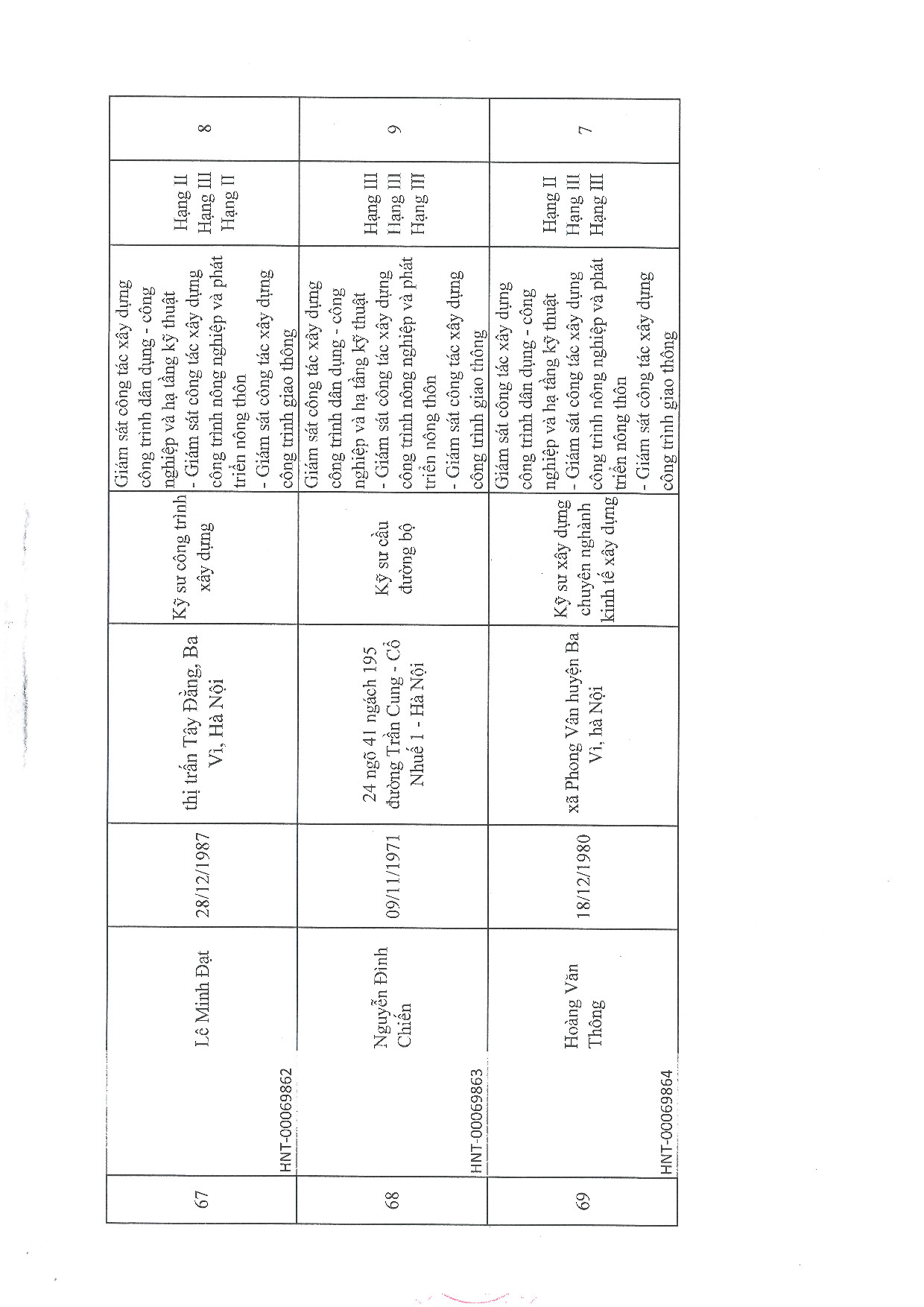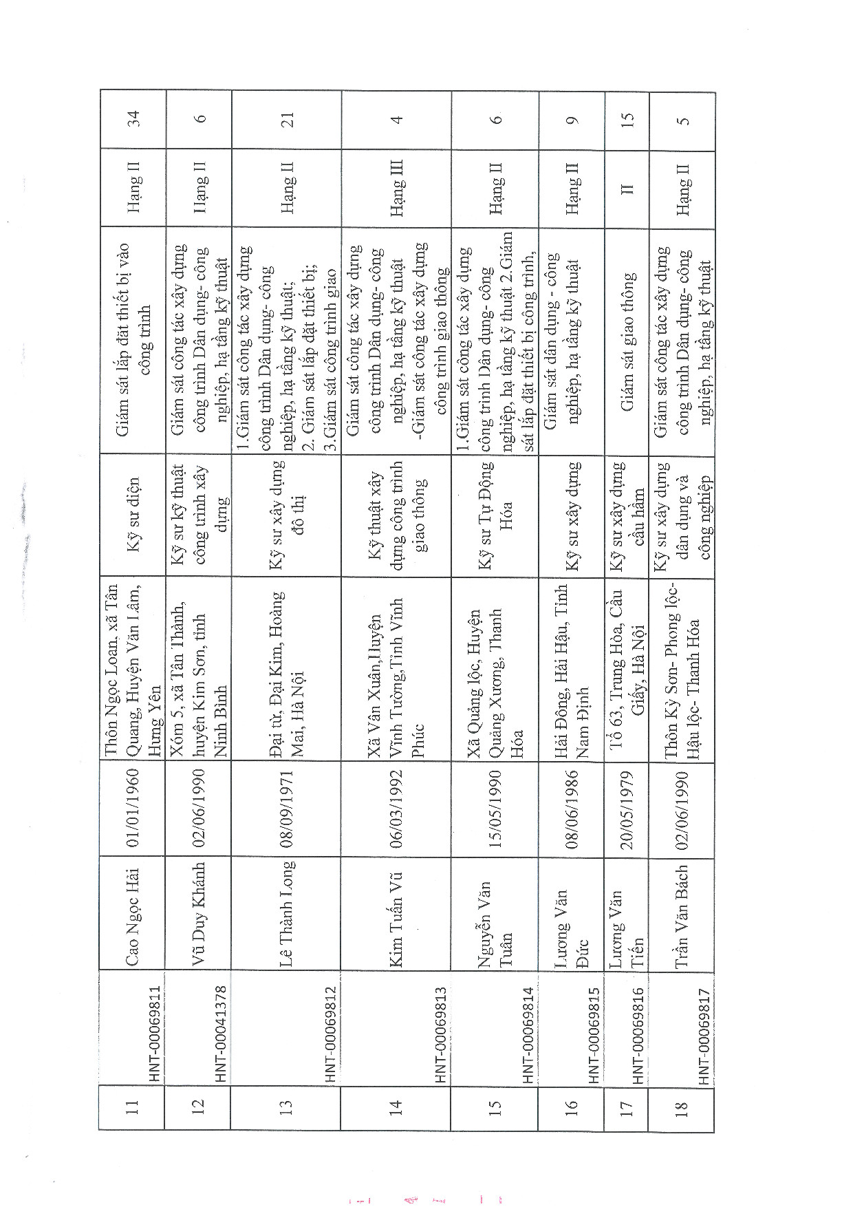| 18 | Trần Văn Bách | 1990 | Kỹ sư xây dựng dân dụng và công nghiệp | HNT-00069817 |