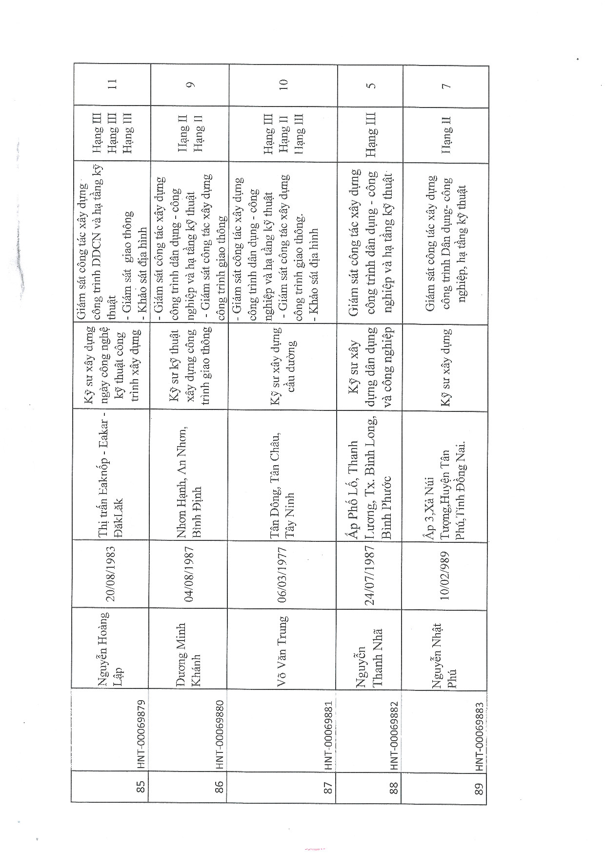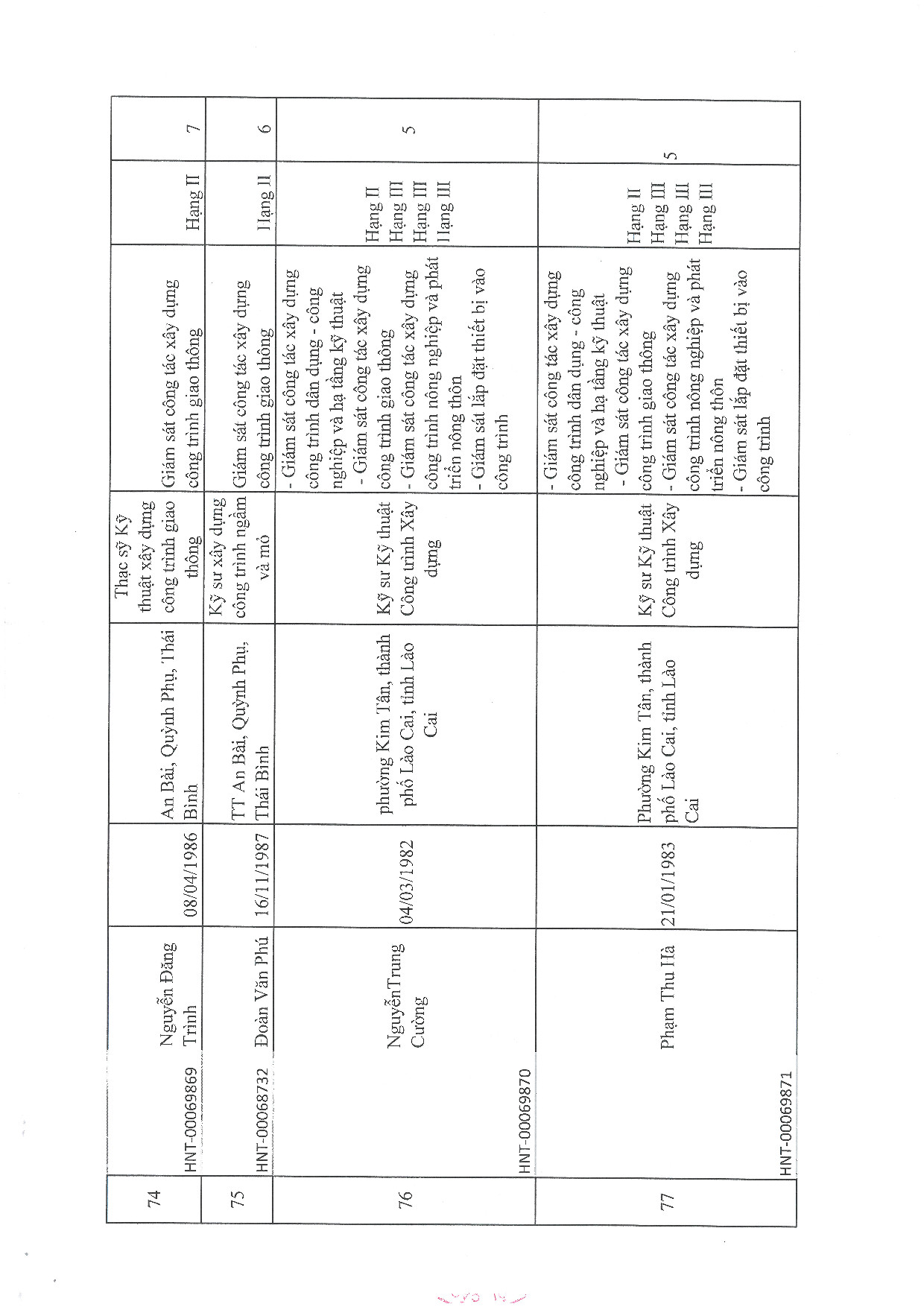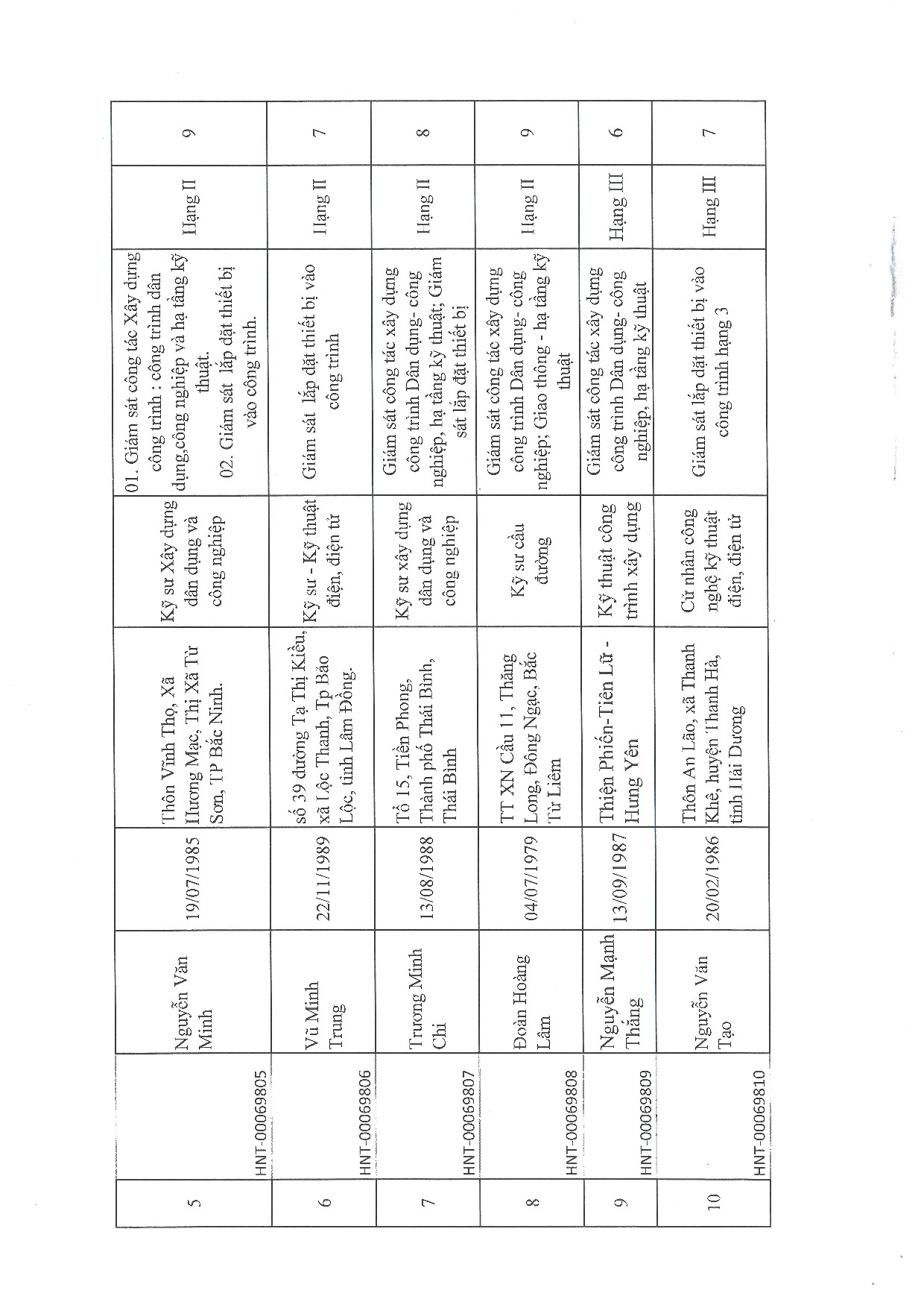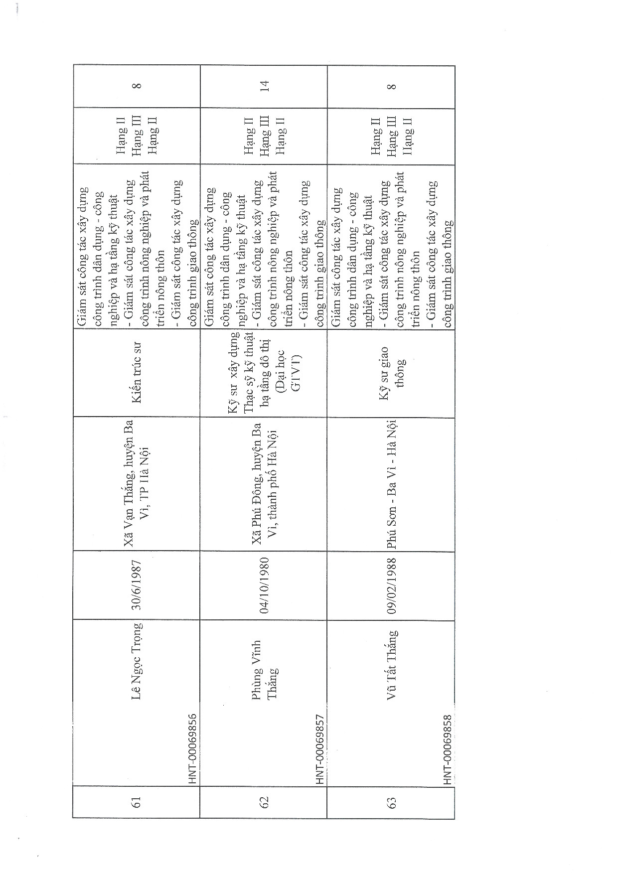| 18 | Trần Văn Bách | 1990 | Kỹ sư xây dựng dân dụng và công nghiệp | HNT-00069817 |