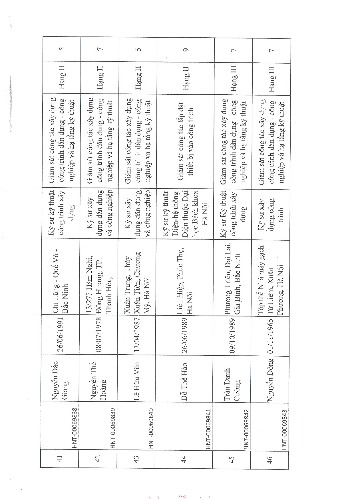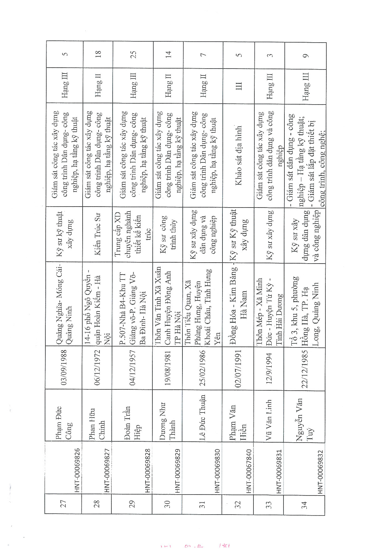 | 31 | Lê Đức Thuận | 1986 | Kỹ sư xây dựng dân dụng và công nghiệp | HNT-00069830 |