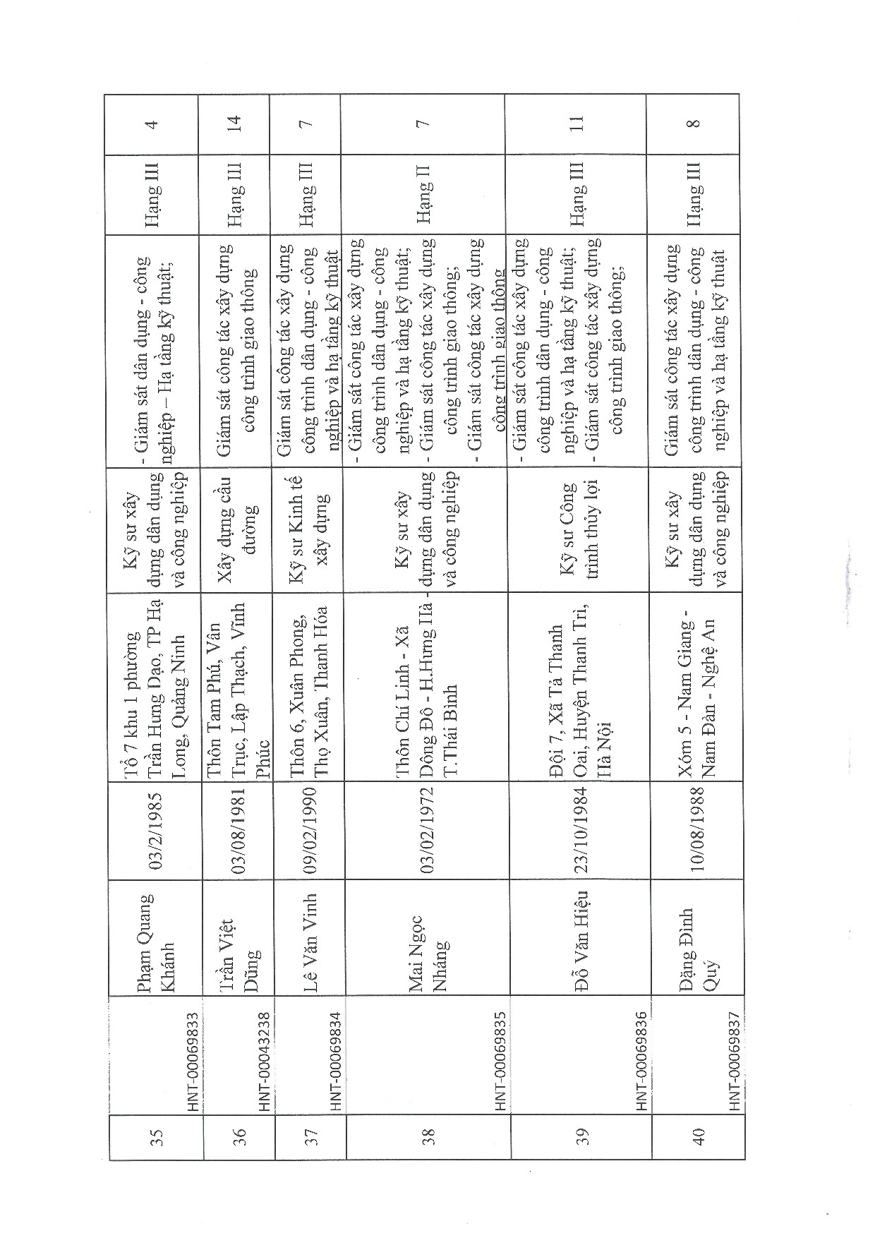 | 40 | Đặng Đình Quý | 1988 | Kỹ sư xây dựng dân dụng và công nghiệp | HNT-00069837 |
