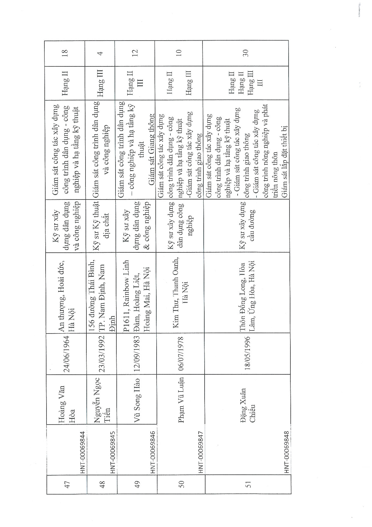 | 47 | Hoàng Văn Hòa | 1964 | Kỹ sư xây dựng dân dụng và công nghiệp | HNT-00069844 |