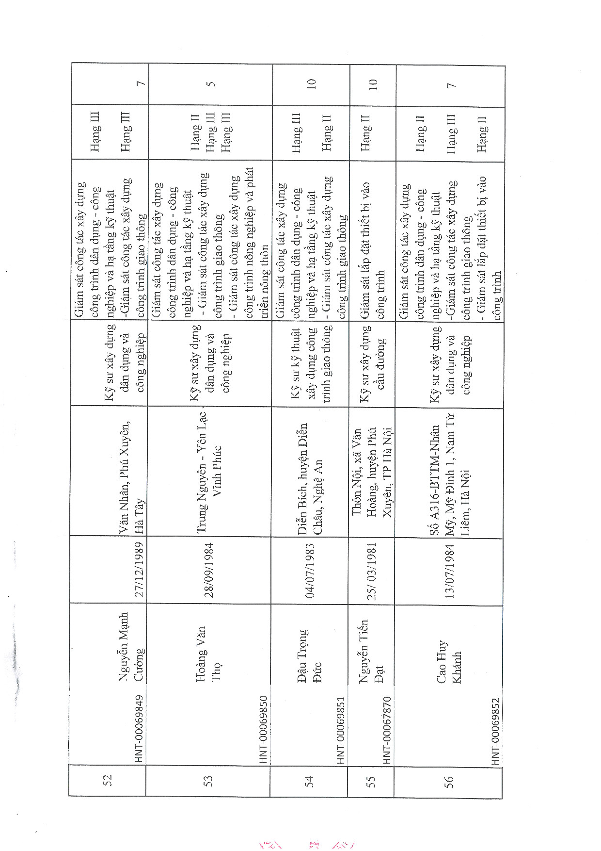 | 52 | Nguyễn Mạnh Cường | 1989 | Kỹ sư xây dựng dân dụng và công nghiệp | HNT-00069849 |