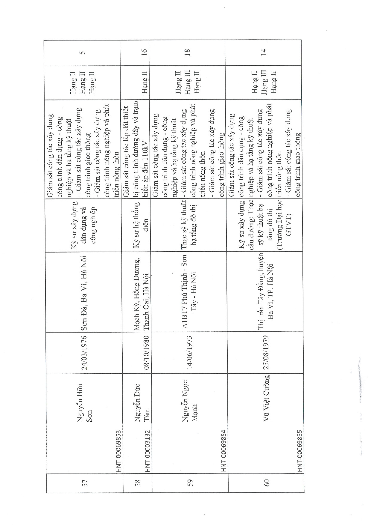 | 57 | Nguyễn Hữu Sơn | 1976 | Kỹ sư kỹ thuật công trình xây dựng | HNT-00069853 |
