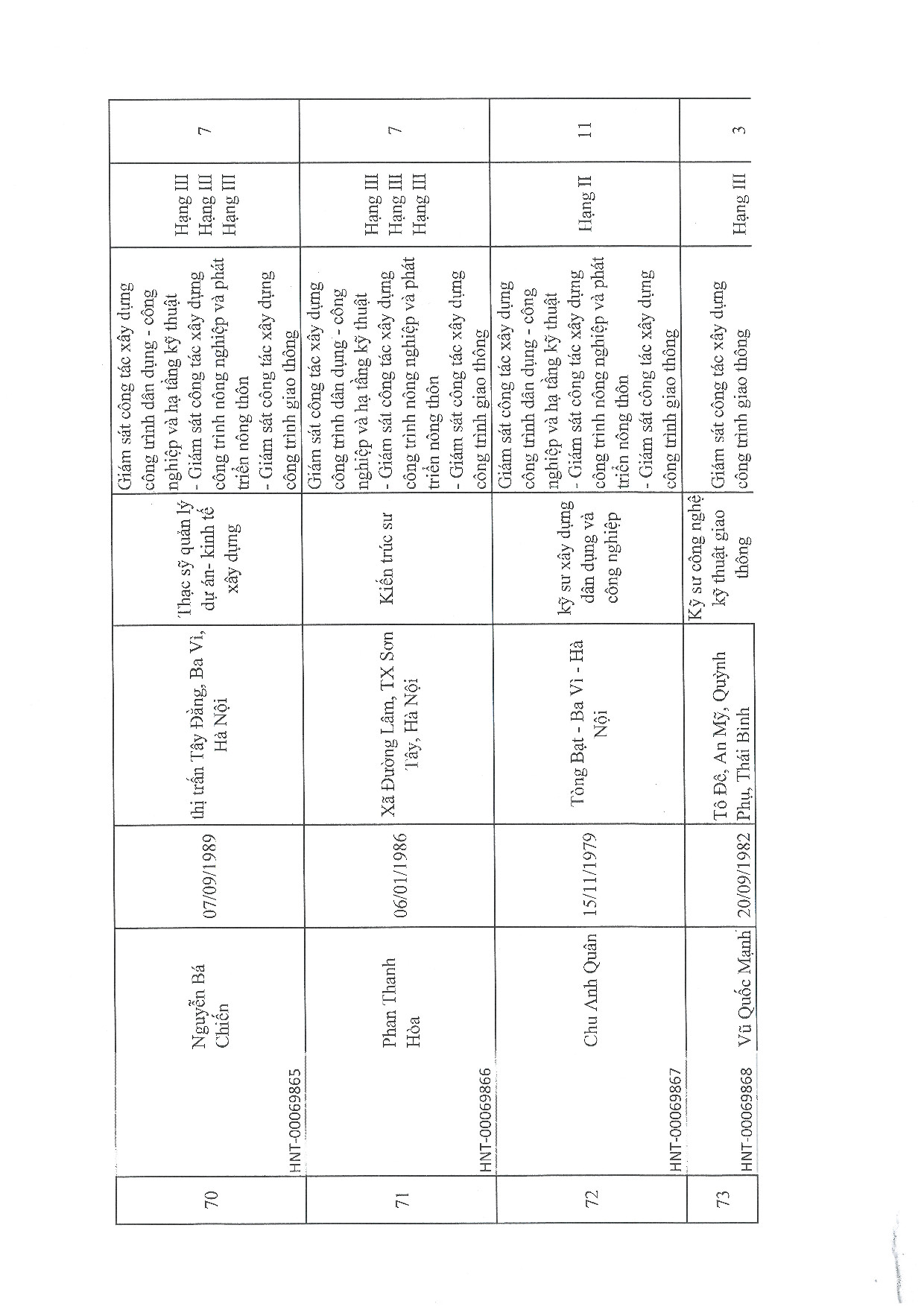 | 73 | Vũ Quốc Mạnh | 1982 | Kỹ sư công nghệ kỹ thuật giao thông | HNT-00069868 |