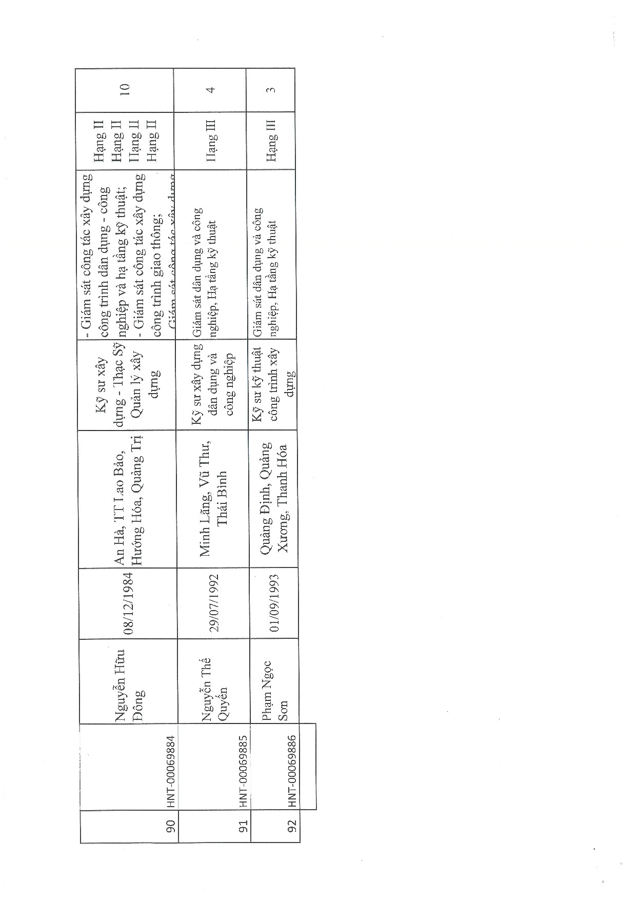 | 90 | Nguyễn Thế Quyến | 1992 | Kỹ sư xây dựng dân dụng và công nghiệp | HNT-00069884 |