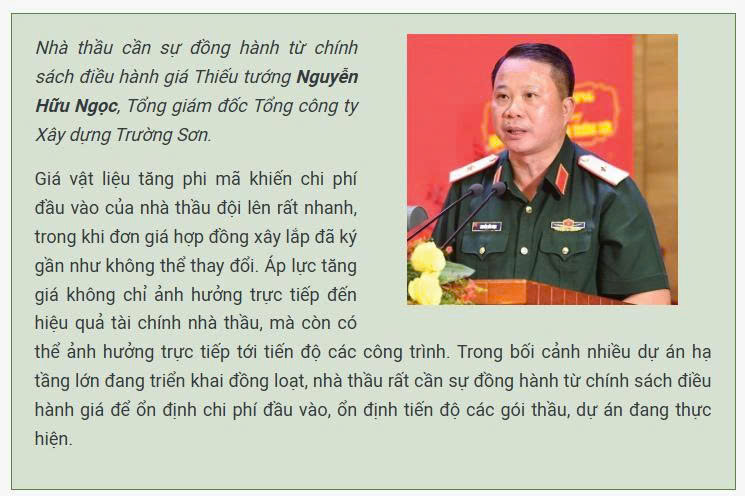Là nhà thầu lớn, Tổng công ty Xây dựng Trường Sơn (Binh đoàn 12 – Bộ Quốc phòng) đang thi công hàng loạt công trình hạ tầng trọng điểm quốc gia như sân bay, đường bộ cao tốc, cầu và cảng biển… Với quy mô doanh thu xây lắp lên tới hàng chục nghìn tỷ đồng mỗi năm, diễn biến giá nhiên liệu, vật liệu xây dựng leo thang thời gian gần đây gây áp lực trực tiếp và mạnh mẽ đối với nhà thầu này.