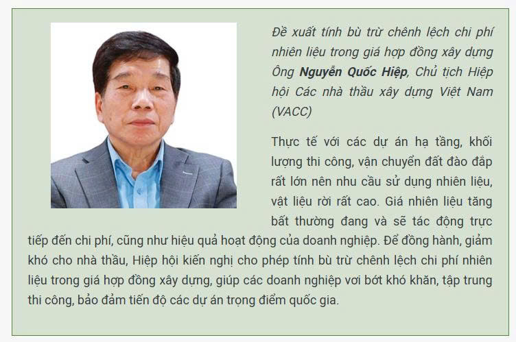 Hai là, có cơ chế phù hợp để ổn định giá các khâu vận chuyển liên quan đến chi phí xăng dầu, giúp nhà thầu ổn định chi phí đầu vào.